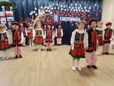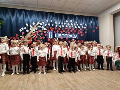 Wspólnie odśpiewane zostały pieśni patriotyczne oraz dzieci przedstawiły program artystyczny. Uroczystość z okazji Narodowego Święta Niepodległości miała na celu rozwijanie wśród wychowanków naszego przedszkola poczucia przynależności narodowej, pielęgnowanie polskiej kultury i tradycji.